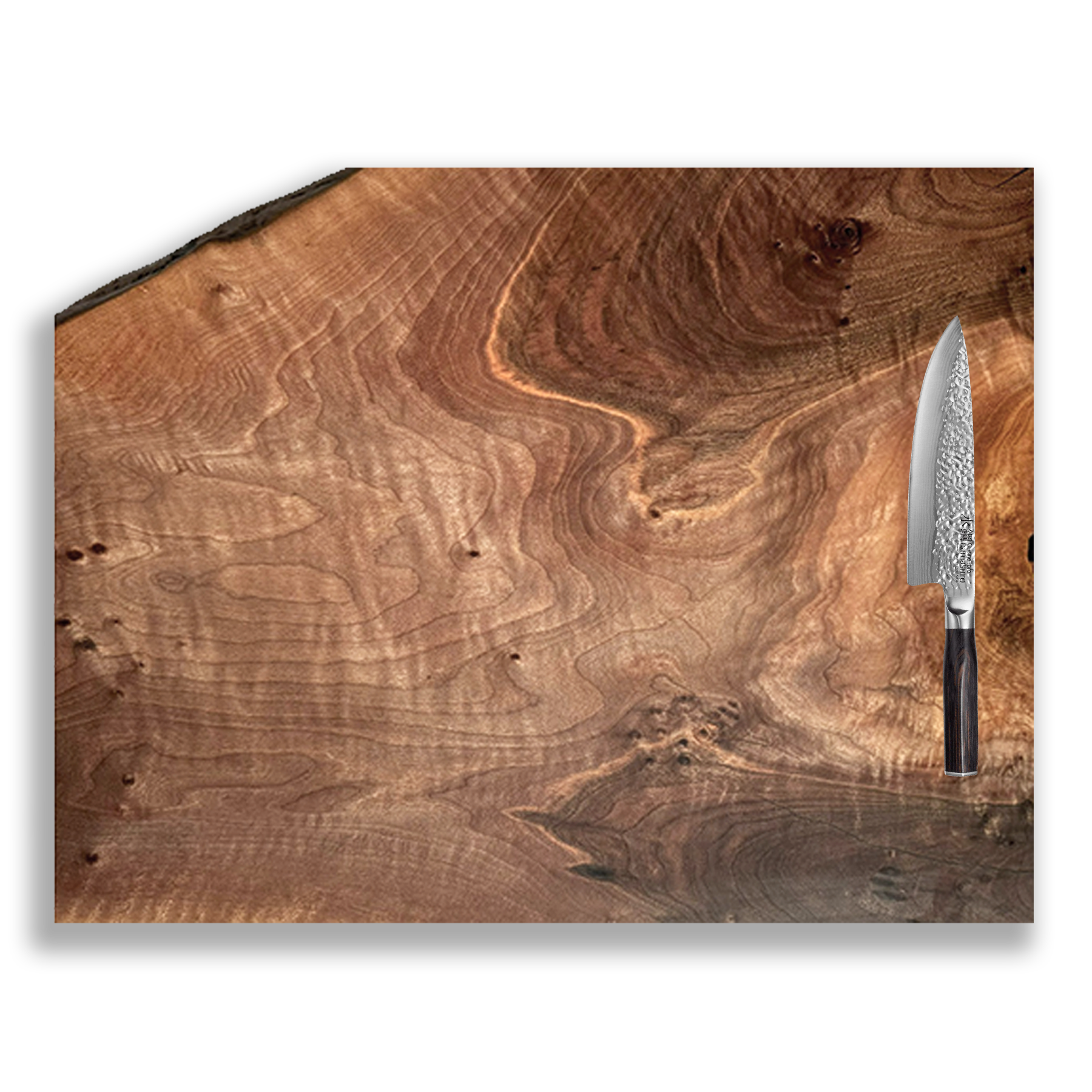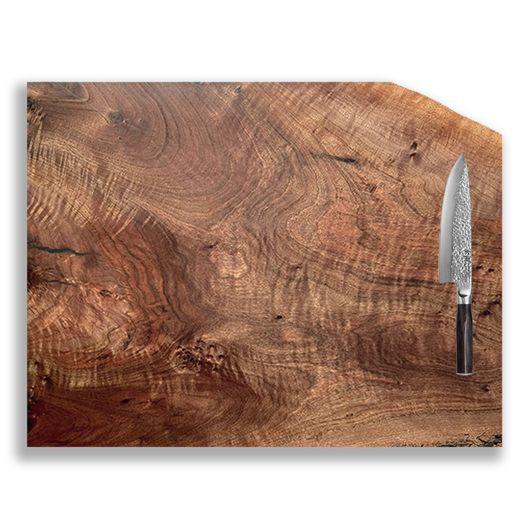 Multidirectional figuring and quilting gives the Ventoux beautiful movement. This one of a kind, oversized chef’s cutting board is meticulously crafted from a sustainably sourced Black Walnut slab from the beautiful Pacific Northwest. The generous space of the board makes it ideal for cutting, boasting a unique marbled walnut that brings elegance to any kitchen. Whether you're an avid home cook or a professional chef, this board seamlessly merges style and functionality, earning its place as an enduring essential in your kitchen. Shown with 8" chef knife for scale.