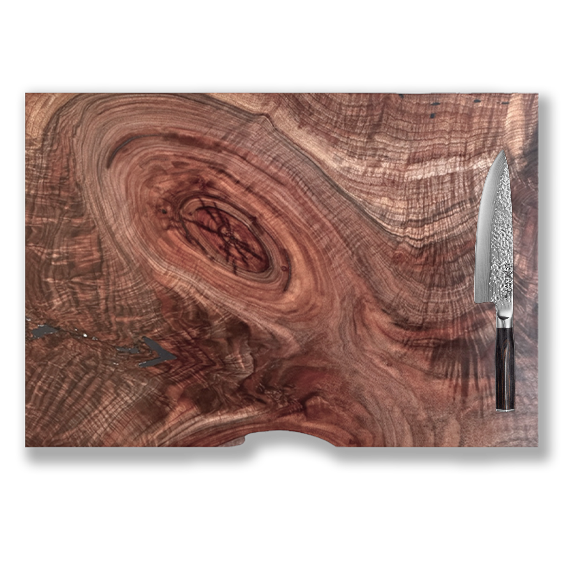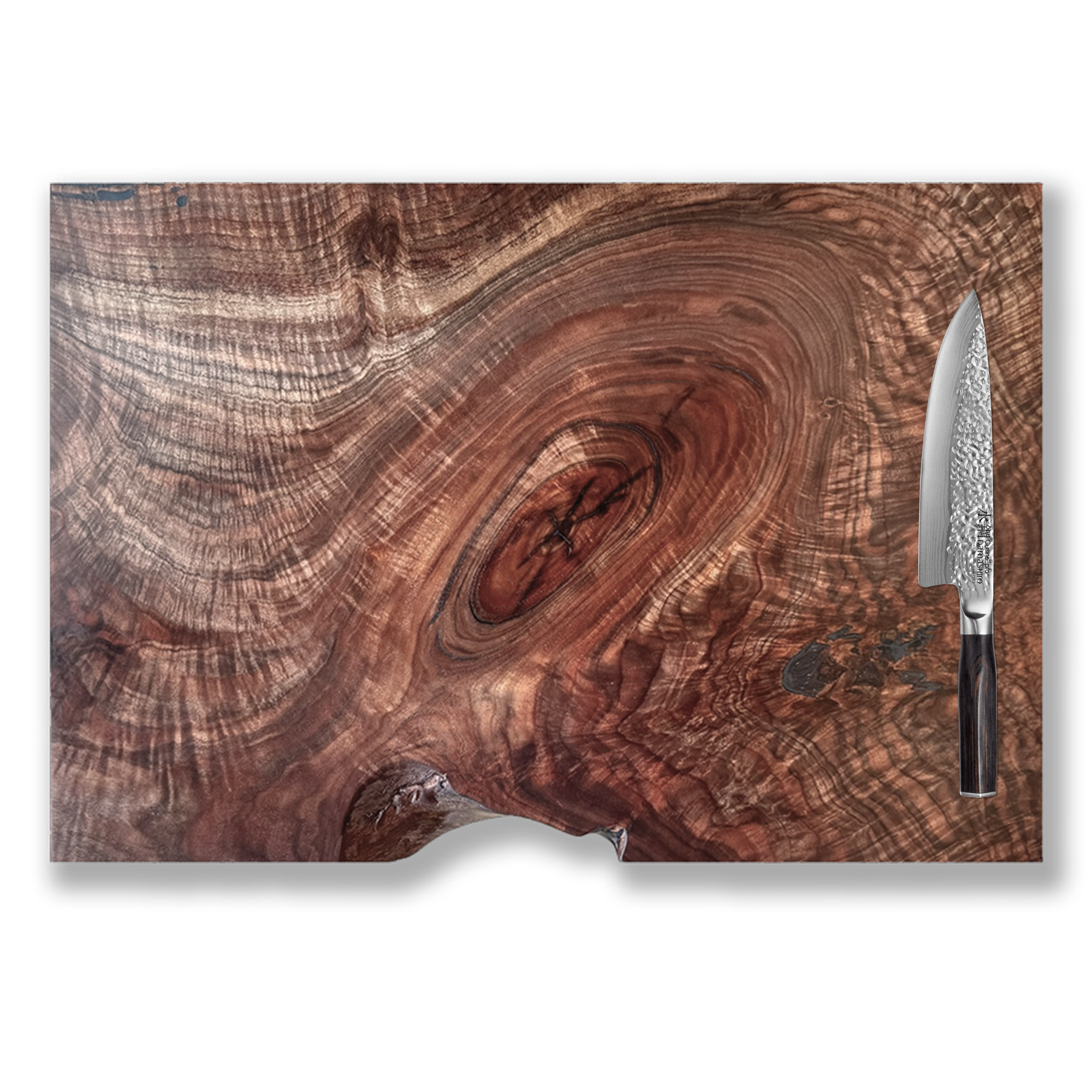 Affectionately dubbed "The Scream" after the painting by Edvard Munch, this is one of the most figured, colorful pieces we have ever laid eyes on. This one of a kind, oversized chef’s cutting board is meticulously crafted from a sustainably sourced Black Walnut live-edge slab from the beautiful Pacific Northwest. The generous space of the board makes it ideal for cutting, boasting a unique marbled walnut that brings elegance to any kitchen. Whether you're an avid home cook or a professional chef, this board seamlessly merges style and functionality, earning its place as an enduring essential in your kitchen arsenal. Shown with 8" chef knife for scale.